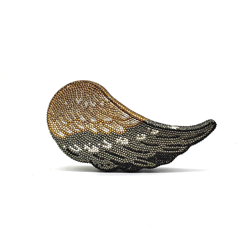 These wing crystal clutches are the ultimate in feminine glamour—one with a dramatic gold to black ombré, the other in ethereal white.