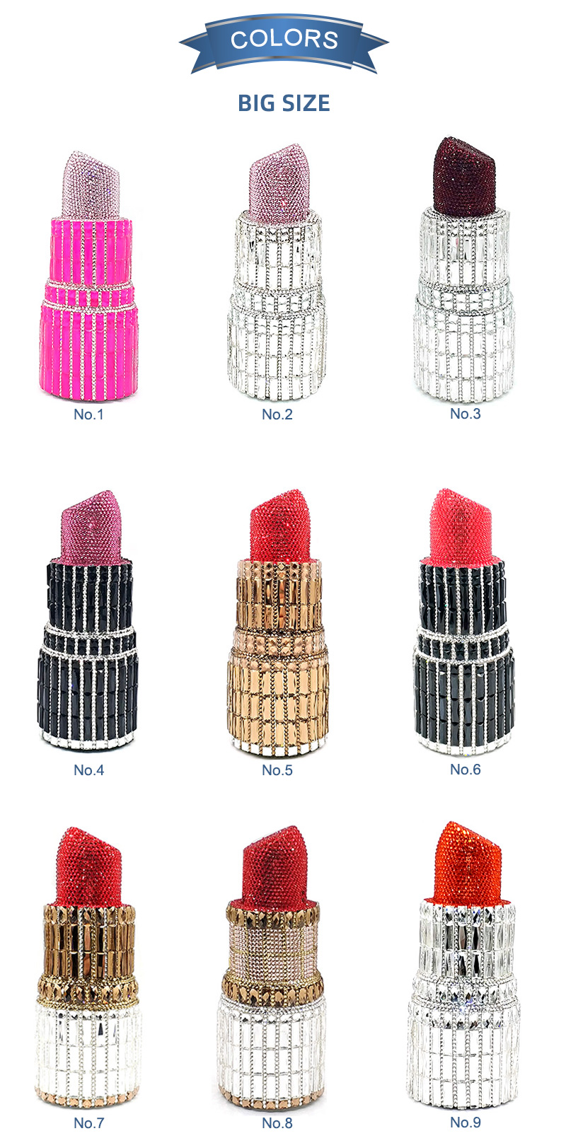 A crystal bag for your special occasions. A luxury and high-end lipstick bag, colorful diamond colors and cool lipstick shape is loved by girls. Diamonds fully covered on the bag more shiny, suitable for young and energetic girls. It is the best choice for many Nigerian women attending evening parties, weddings, ceremony, etc.