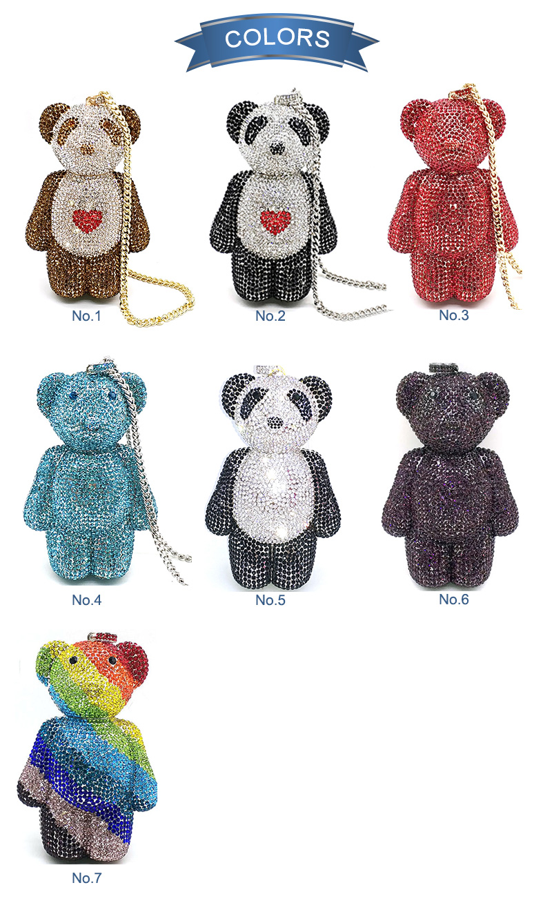 A classical crystal bag for your special occasions. A lovely panda bag, small and lightweight panda, panda body printed with red hearts, sparkling diamonds, is a gorgeous decorative purse. Many Nigeria women like this kinds of the evening bag. You can use it for attending evening parties, weddings, ceremony, etc.